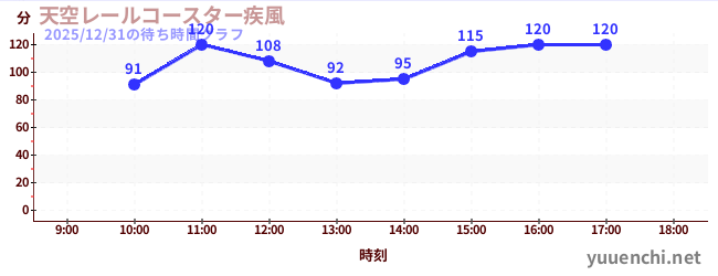 2025/12/31の待ち時間グラフ (天空レールコースター疾風)
