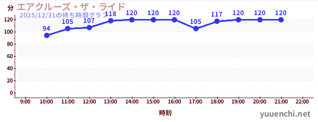 2025/12/31の待ち時間グラフ (エアクルーズ・ザ・ライド)