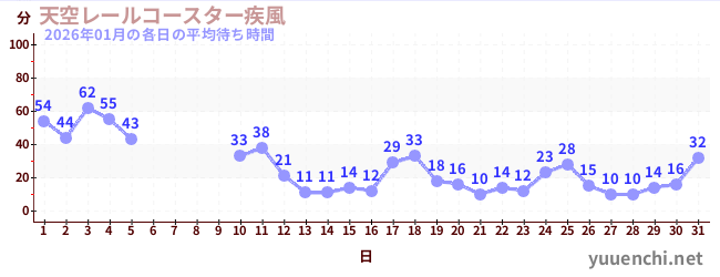 2026/01の一日平均待ち時間 (天空レールコースター疾風)