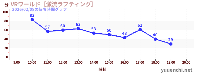 2026/02/08の待ち時間グラフ (VRワールド[激流ラフティング])