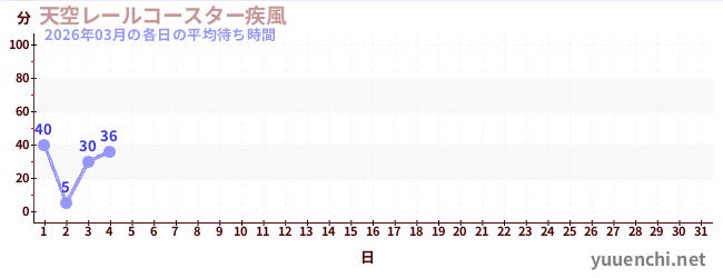 2026/03の一日平均待ち時間 (天空レールコースター疾風)