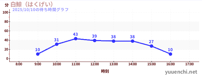 2025/10/10の待ち時間グラフ ホーム 待ち時間グラフ一覧 2025/10/10の待ち時間グラフ 画像提供:ナガシマスパーランド リアルタイム待ち時間 過去の混雑カレンダー 今日の混雑情報 アトラクション一覧 待ち時間グラフ アトラクションランキング ある日の時間ごとグラフ ある月の日ごとグラフ ある年の月ごとグラフ 直近3週間グラフ ある年に日ごとグラフ 10/04 10/05 10/06 10/07 10/08 10/09 10/10 2025/10/10の待ち時間グラフ (白鯨(はくげい))