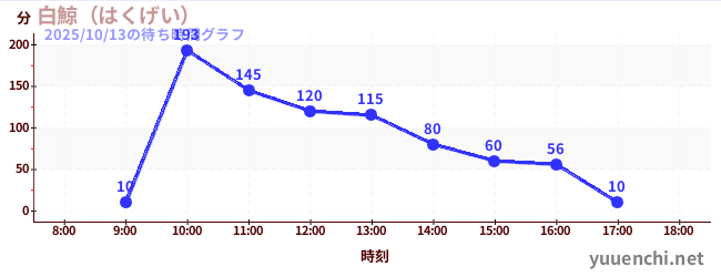 2025/10/13の待ち時間グラフ ホーム 待ち時間グラフ一覧 2025/10/13の待ち時間グラフ 画像提供:ナガシマスパーランド リアルタイム待ち時間 過去の混雑カレンダー 今日の混雑情報 アトラクション一覧 待ち時間グラフ アトラクションランキング ある日の時間ごとグラフ ある月の日ごとグラフ ある年の月ごとグラフ 直近3週間グラフ ある年に日ごとグラフ 10/08 10/09 10/10 10/11 10/12 10/13 10/14 2025/10/13の待ち時間グラフ (白鯨(はくげい))