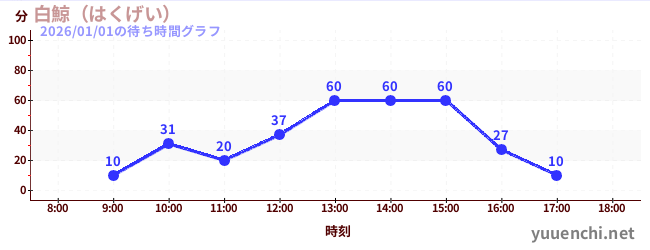 2026/01/01の待ち時間グラフ ホーム 待ち時間グラフ一覧 2026/01/01の待ち時間グラフ 画像提供:ナガシマスパーランド リアルタイム待ち時間 過去の混雑カレンダー 今日の混雑情報 アトラクション一覧 待ち時間グラフ アトラクションランキング ある日の時間ごとグラフ ある月の日ごとグラフ ある年の月ごとグラフ 直近3週間グラフ ある年に日ごとグラフ 12/27 12/28 12/29 12/30 12/31 01/01 01/02 2026/01/01の待ち時間グラフ (白鯨(はくげい))