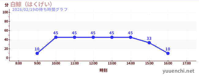 2026/02/19の待ち時間グラフ ホーム 待ち時間グラフ一覧 2026/02/19の待ち時間グラフ 画像提供:ナガシマスパーランド リアルタイム待ち時間 過去の混雑カレンダー 今日の混雑情報 アトラクション一覧 待ち時間グラフ アトラクションランキング ある日の時間ごとグラフ ある月の日ごとグラフ ある年の月ごとグラフ 直近3週間グラフ ある年に日ごとグラフ 02/15 02/16 02/17 02/18 02/19 02/20 02/21 2026/02/19の待ち時間グラフ (白鯨(はくげい))