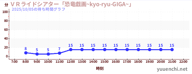 2025/10/05の待ち時間グラフ (VRライドシアター「恐竜戯画~kyo-ryu-GIGA~」 )