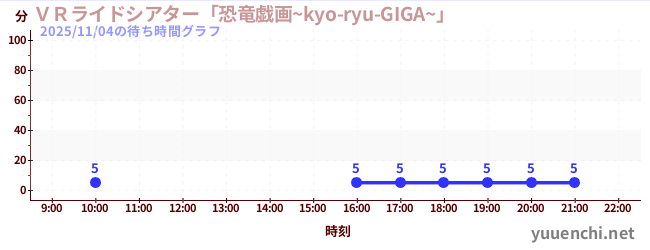 2025/11/04の待ち時間グラフ (VRライドシアター「恐竜戯画~kyo-ryu-GIGA~」 )