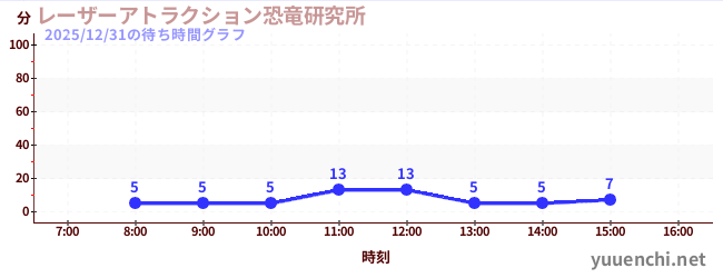 2025/12/31の待ち時間グラフ (レーザーアトラクション恐竜研究所 )