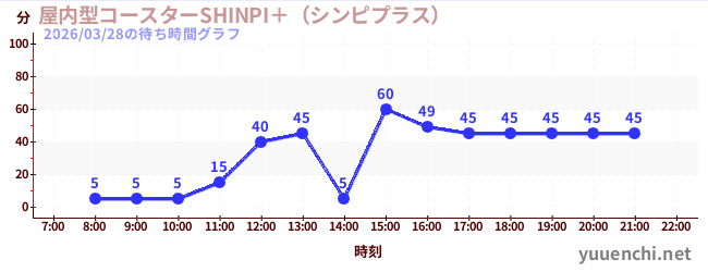 2026/03/28の待ち時間グラフ (屋内型コースターSHINPI+(シンピプラス) )