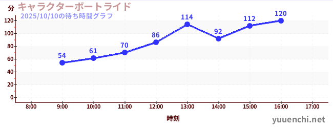 2025/10/10の待ち時間グラフ (キャラクターボートライド)