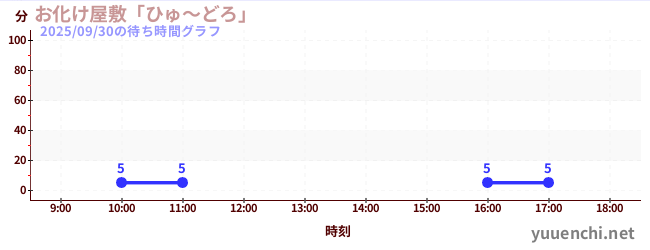2025/09/30の待ち時間グラフ (お化け屋敷「ひゅ~どろ」)