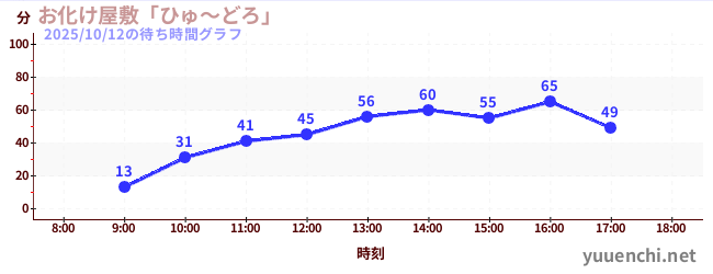 2025/10/12の待ち時間グラフ (お化け屋敷「ひゅ~どろ」)
