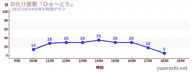 2025/10/14の待ち時間グラフ (お化け屋敷「ひゅ~どろ」)