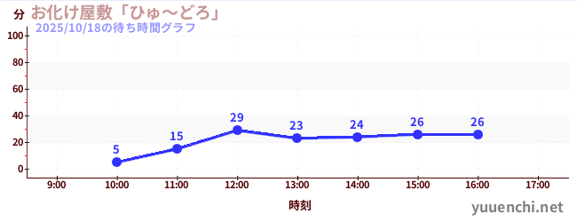 2025/10/18の待ち時間グラフ (お化け屋敷「ひゅ~どろ」)