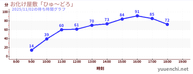 2025/11/02の待ち時間グラフ (お化け屋敷「ひゅ~どろ」)