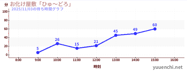 2025/11/03の待ち時間グラフ (お化け屋敷「ひゅ~どろ」)