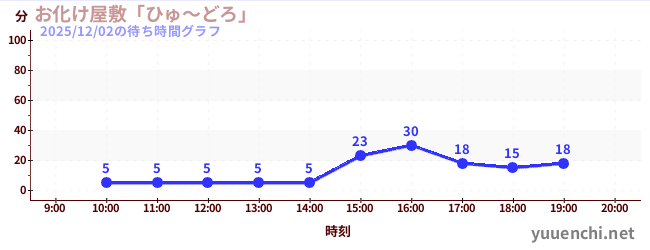 2025/12/02の待ち時間グラフ (お化け屋敷「ひゅ~どろ」)