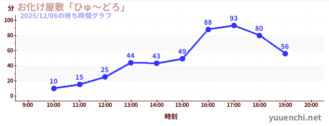 2025/12/06の待ち時間グラフ (お化け屋敷「ひゅ~どろ」)