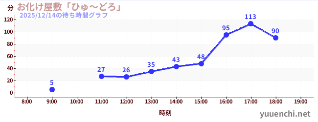 2025/12/14の待ち時間グラフ (お化け屋敷「ひゅ~どろ」)