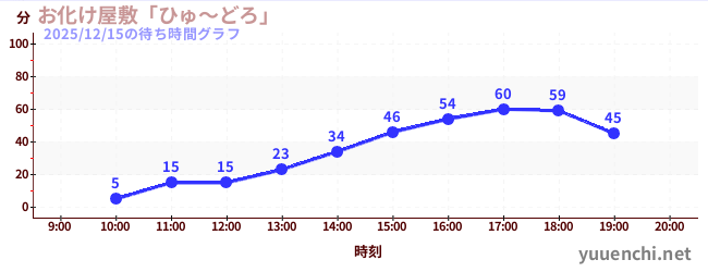 2025/12/15の待ち時間グラフ (お化け屋敷「ひゅ~どろ」)
