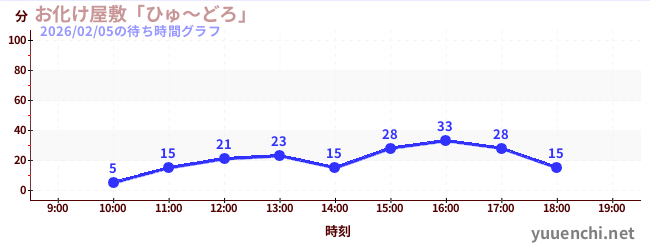 2026/02/05の待ち時間グラフ (お化け屋敷「ひゅ~どろ」)