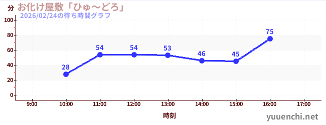 2026/02/24の待ち時間グラフ (お化け屋敷「ひゅ~どろ」)