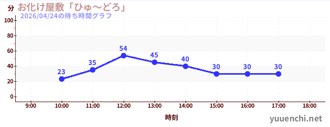 2026/04/24の待ち時間グラフ (お化け屋敷「ひゅ~どろ」)
